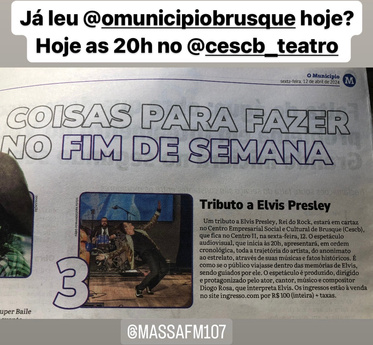 à vida e obra de Elvis Presley. foi escrito, dirigido e estrelado pelo ator, cantor, músico, compositor e roteirista, Diogo Rosa. Ele estreou inicialmente no formato de show, em Balneário Camboriú em 2023. E no formato de teatro musical tiveram várias apresentações nos teatros de Santa Catarina em 2024.